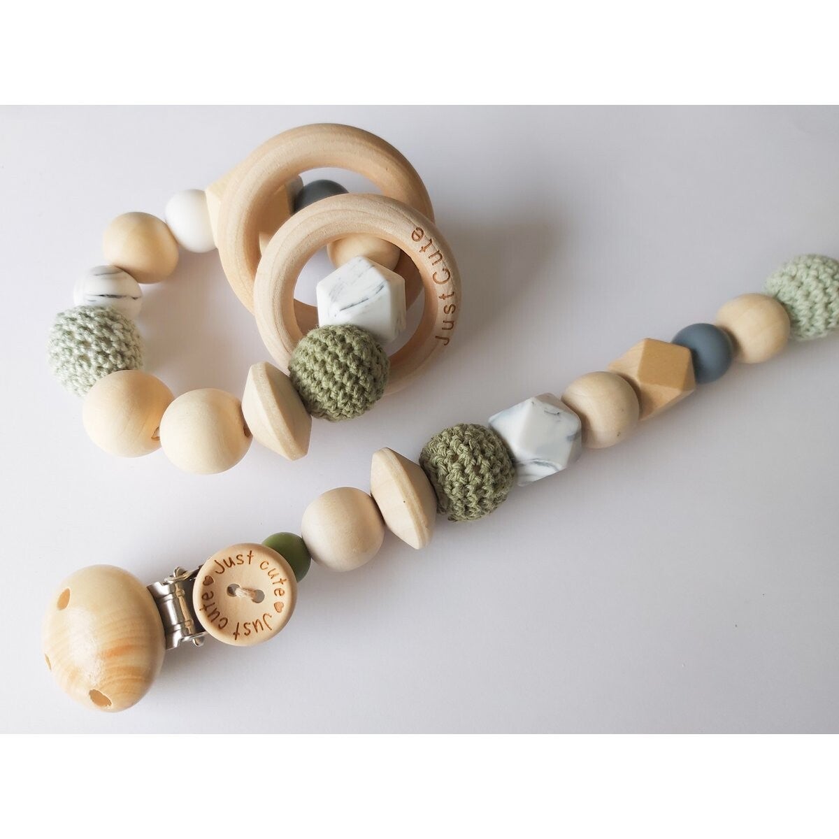 Met dit houten speenkoord gecombineerd met siliconen en gehaakte kralen in de kleuren legergroen, donkergrijs en mint komt je kleintje hip voor de dag.